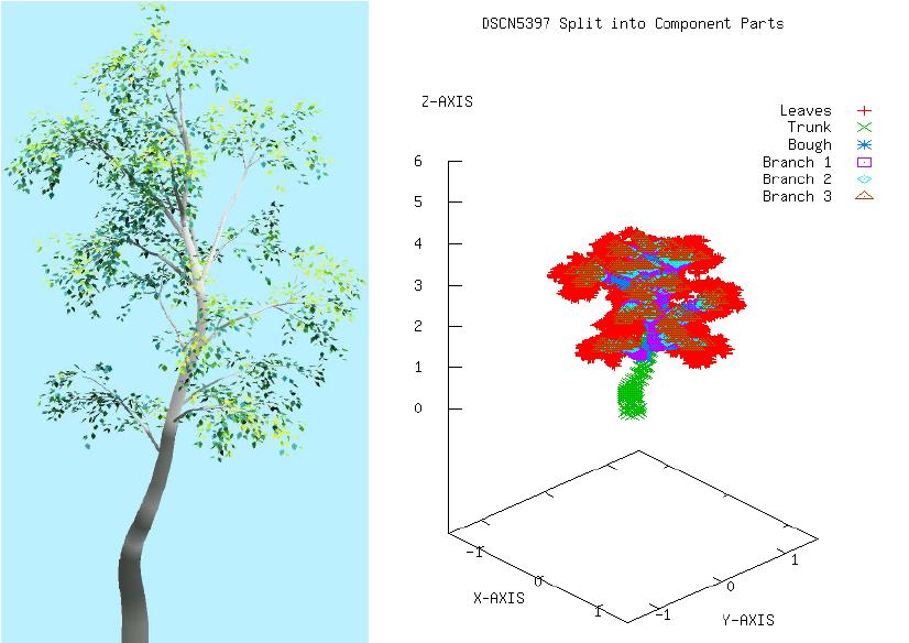 Figure 1 (a) Left: Image DSCN5397 of a birch tree (b) Middle: OnyxTREE Broadleaf screenshot of model DSCN5397 (c) A graph showing DSCN5397 split into its component parts and displayed separately.